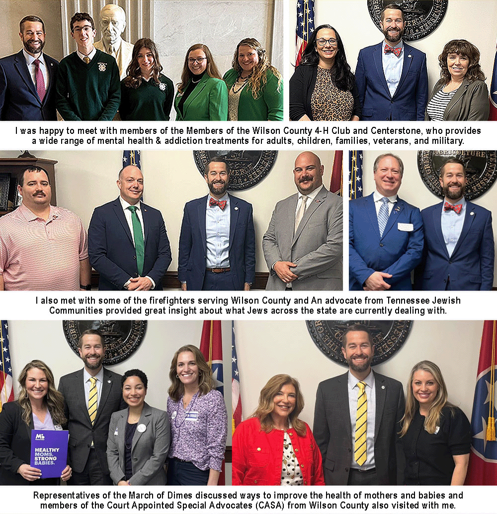 James K. Polk Day: The House on Monday passed legislation to designate November 2 annually as James K. Polk Day to honor President Polk's service to Tennessee and the nation. House Bill 1479, sponsored by State Rep. Gino Bulso, R-Brentwood, recognizes the 11th president's accomplishments and role in fulfilling the Manifest Destiny of the United States to be a beacon of liberty and freedom across North America. The companion version of House Bill 1479 is still advancing in the Senate.